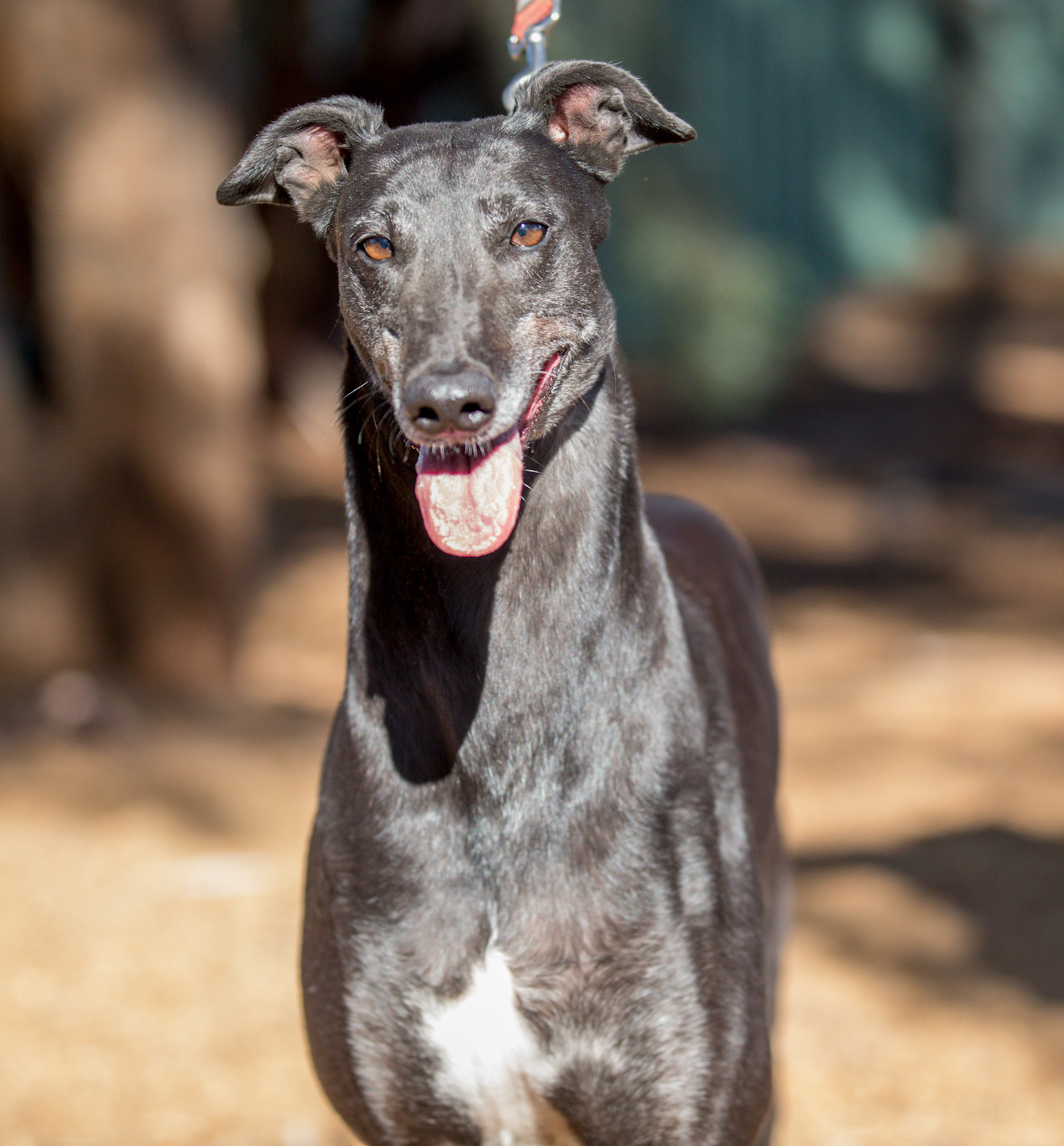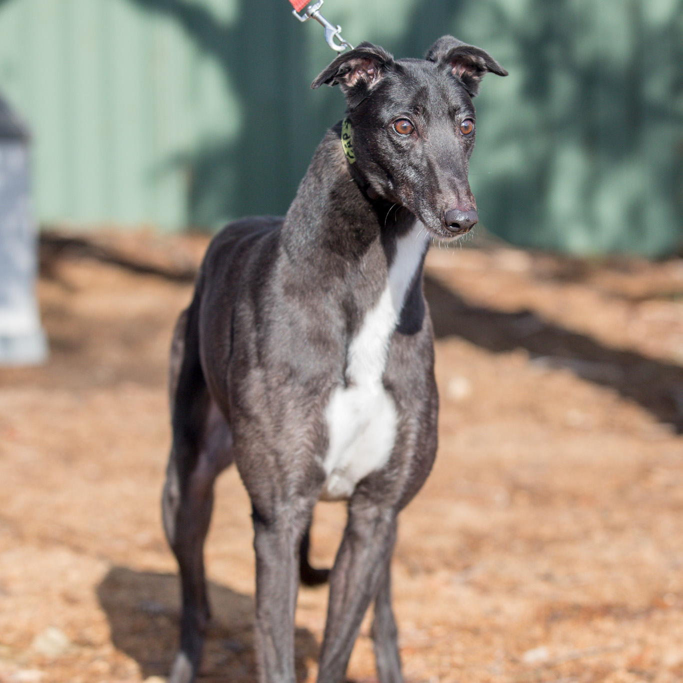If you are looking for a smallish male greyhound, well look no further than Pershing! Pershing can act like an excitable goofy puppy upon first meeting him but then settles down and is a friendly and affectionate boy. Pershing may suit living with or without a canine pal of similar size and children aged 10 years and older. Due to his puppyish nature, he wouldn’t be suited to live in an apartment or with elderly.