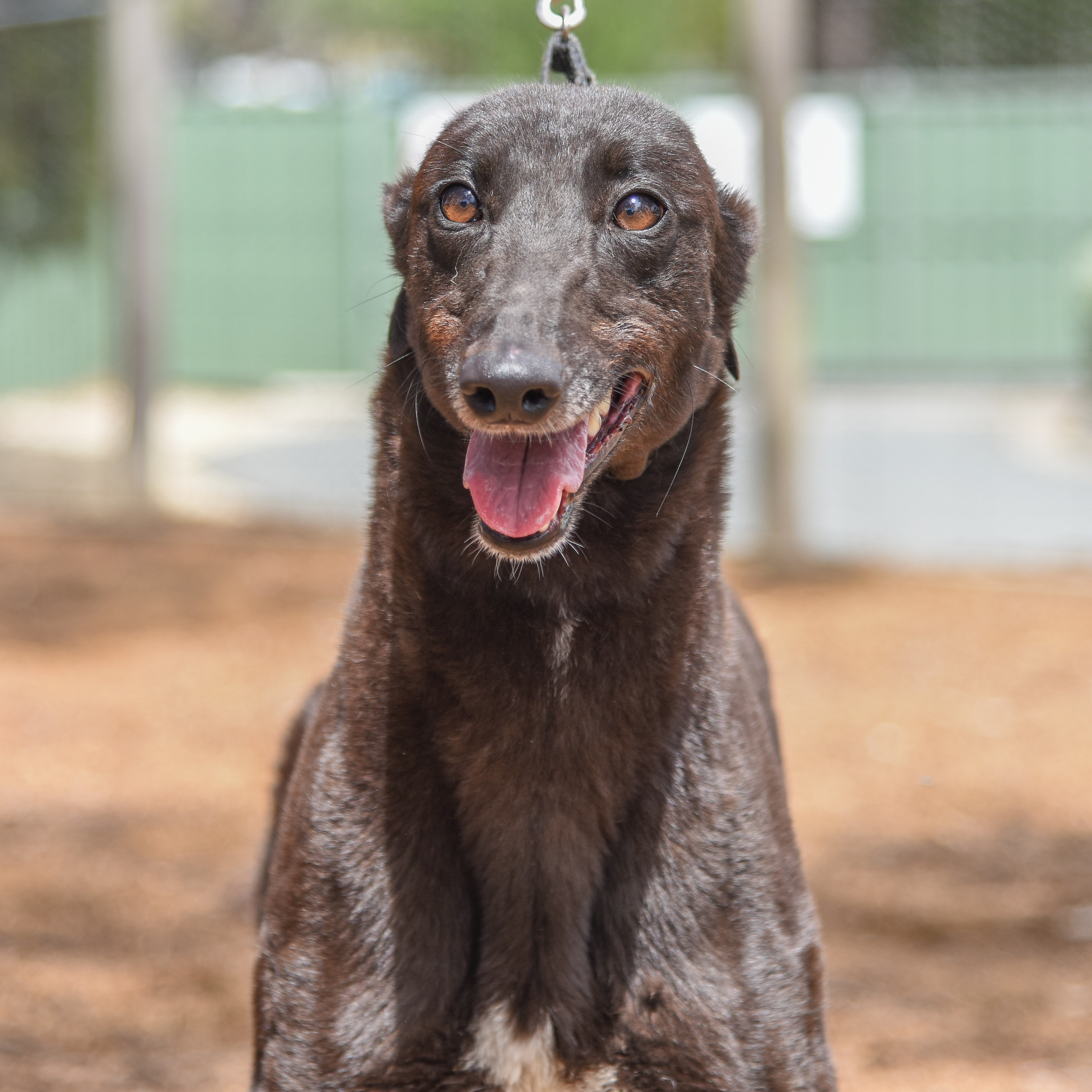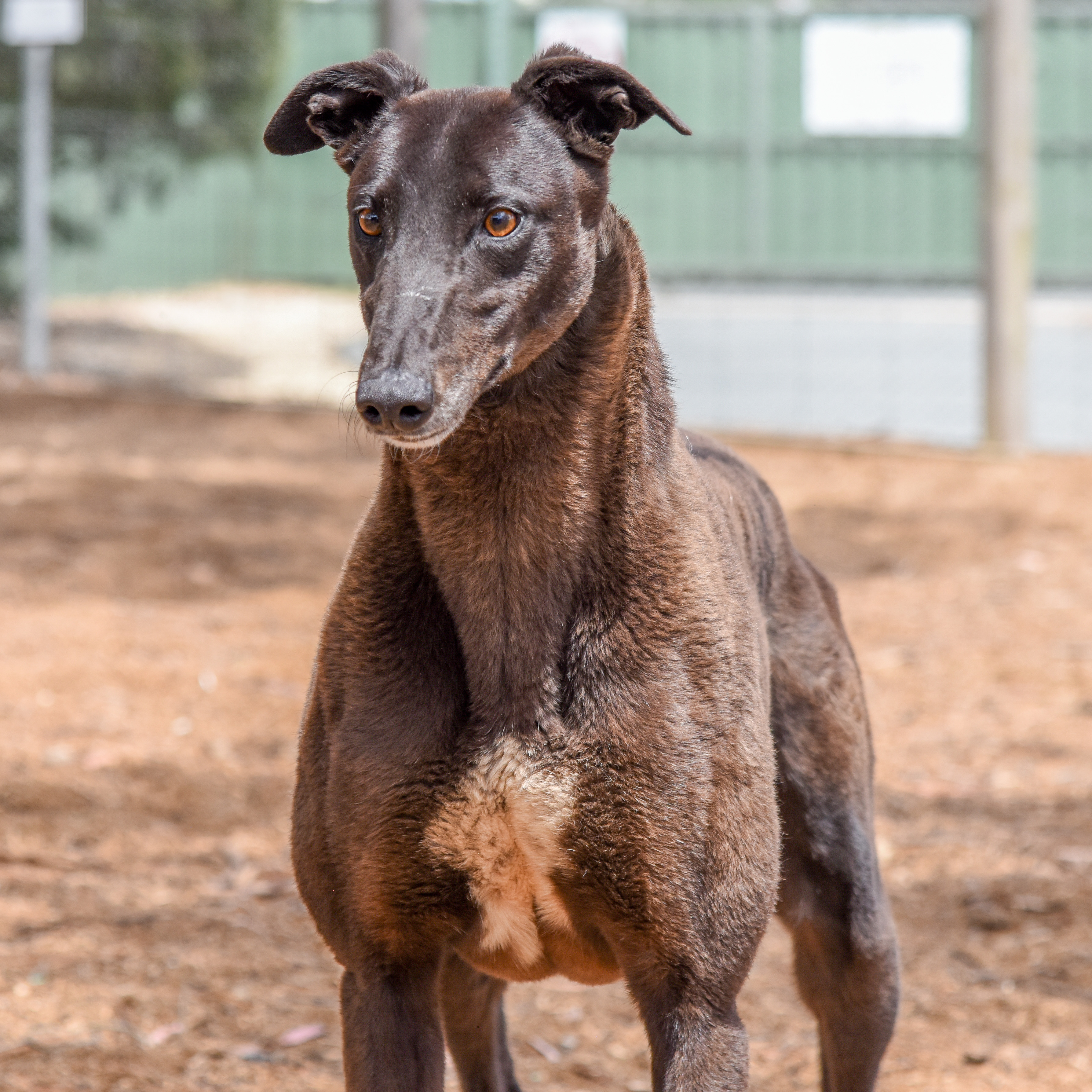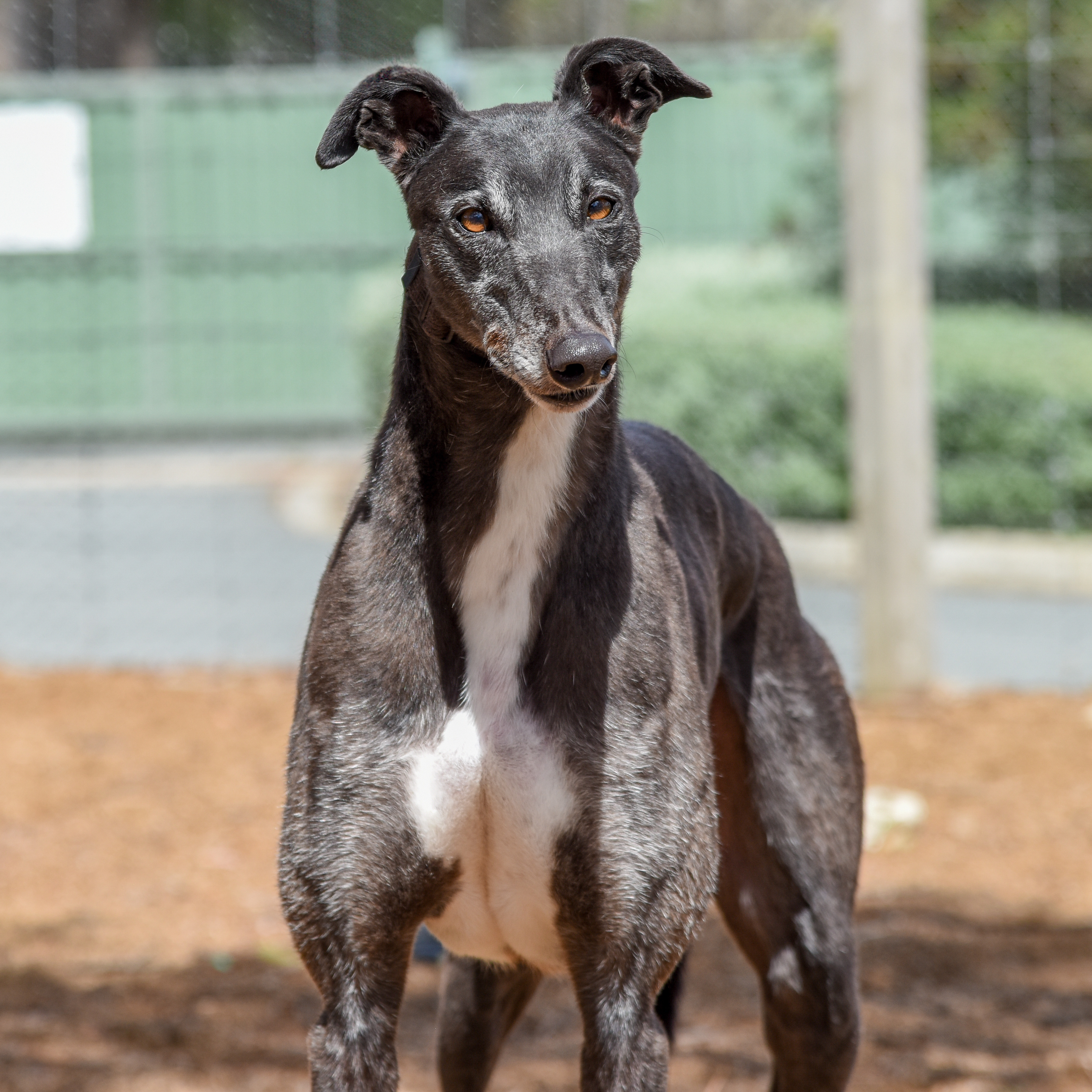 Can you hear an Echo? Its saying “Hey you! I’m ready to be adopted, adopted, adopted…..”. Ok enough with the cheesy jokes. But seriously, this girl is a super sweet, personable, quiet, polite and a little sprinkle of puppy. She can be a little shy in new environments, but she soon relaxes and shows her charm. We think she may suit living in a home with children 10 and over and possibly with a play buddy of any size as long as they are willing to play with a greyhound. We also think she may suit living with full timeworkers.