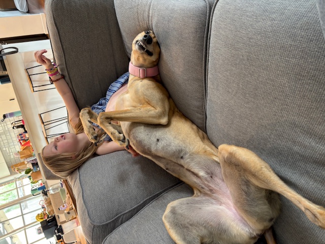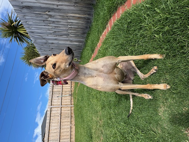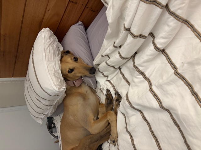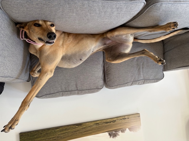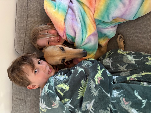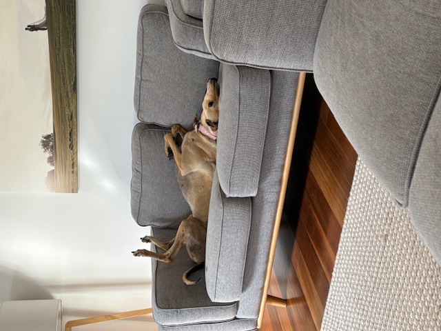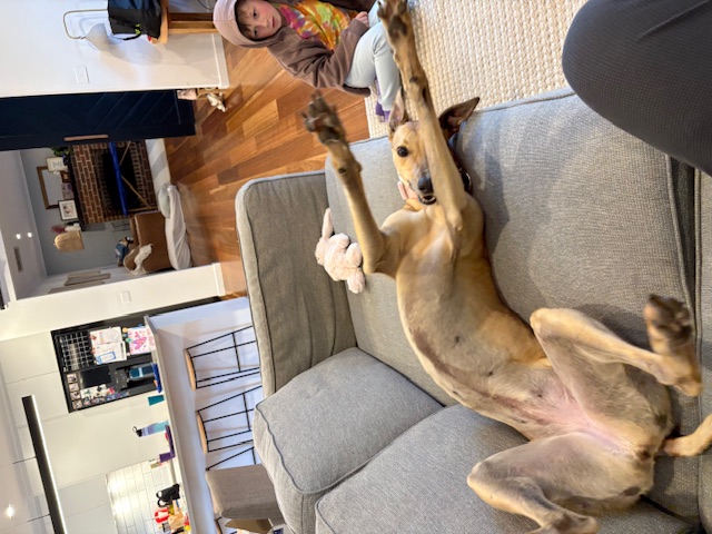 She’s funny, goofy, loving and gentle. Our kids love seeing her zoom around the garden and snuggled up on the couch.I’m so happy we chose to adopt a greyhound through GAP, it’s been the best decision ever!She has settled into house life well and uses her dog door with ease, only had a few accidents inside and learns so fast.